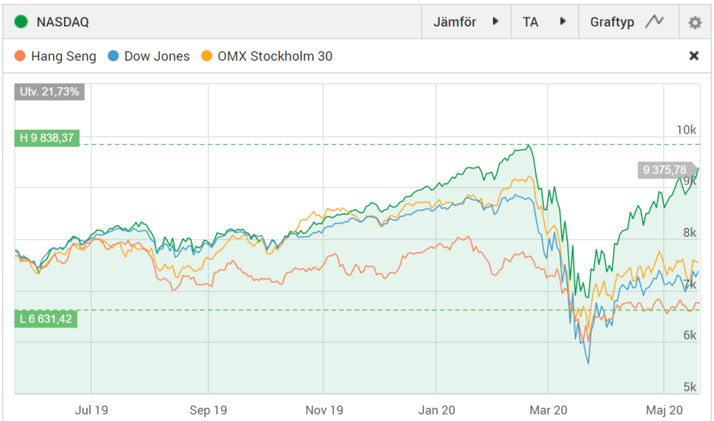 Än har vi väl inte sett vilka bolag som marknaden tror kommer bli de relativa vinnarna inom t.ex amerikanska banker eller resebranschens hotellkedjor/flygbolag, utan detta ligger kanske längre fram i tiden då deras överskådliga framtid fortfarande är lite snårigare att navigera i. Men inom många andra, mindre drabbade eller till och med gynnade, sektorer har vi sett ett riktigt rally. Båda jättarna Amazon och Facebook stängde igår på all time high, där den sistnämnda på kort tid använt just sin enorma kassa till ett förvärv (Giphy), en equity stake (Jio) och nya produktlanseringar (Shops). Jag ser också att smarta investerare som Chuck Akre och Pat Dorsey ökar på sin redan stora positioner i Mastercard respektive Facebook och Alphabet, vilket såklart ger mig lite vatten på min kvarn här. Att Warren Buffett och Charlie Munger via Berkshire Hathaway inte monsterköpt några digitala vinnare kanske säger mer om deras investeringsstil (eller kapitalbehovet hos deras onoterade bolag) än om digitala affärsmodeller? Jag vet inte.