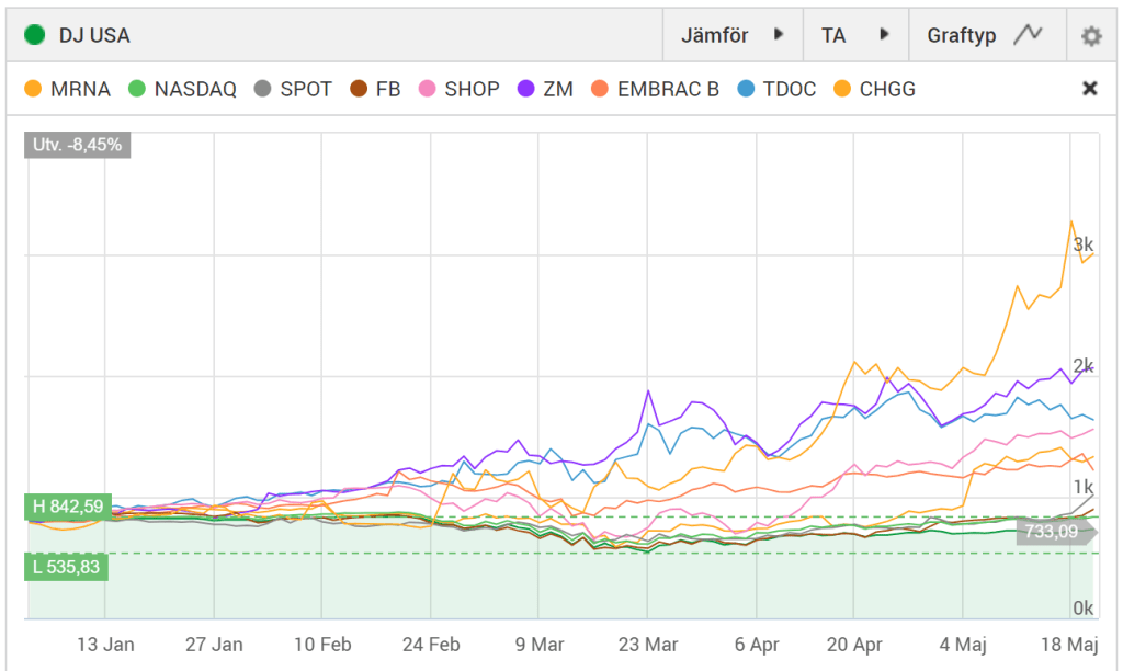 Hälsovårdsbolag med koppling antingen direkt mot viruset (Moderna, Novavax), digitala modeller via telemedicin (Teladoc, Livongo, Kry, Babylon) eller indirekt via andra typer av tjänster vars efterfrågan trappats upp på grund av sjukdomsbilden (Masimo, Getinge).